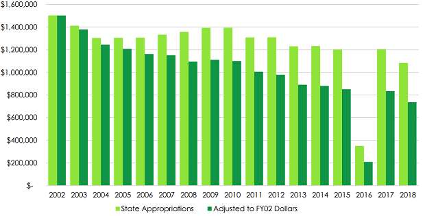 The dependence of Illinois public universities on tuition and fees has grown significantly in recent years as state appropriations have declined in unadjusted dollars. The declines in state appropriation support are even greater when inflation is taken into account. As shown in Figure 1, 2002 was the peak year for state appropriation support for Illinois public universities ($1.5 billion). When accounting for inflation and new, unfunded mandates public university operations funding for Fiscal Year 2018 is less than half of what it was in Fiscal Year 2002 ($736 million in 2018 relative to $1.5 billion in 2002).
